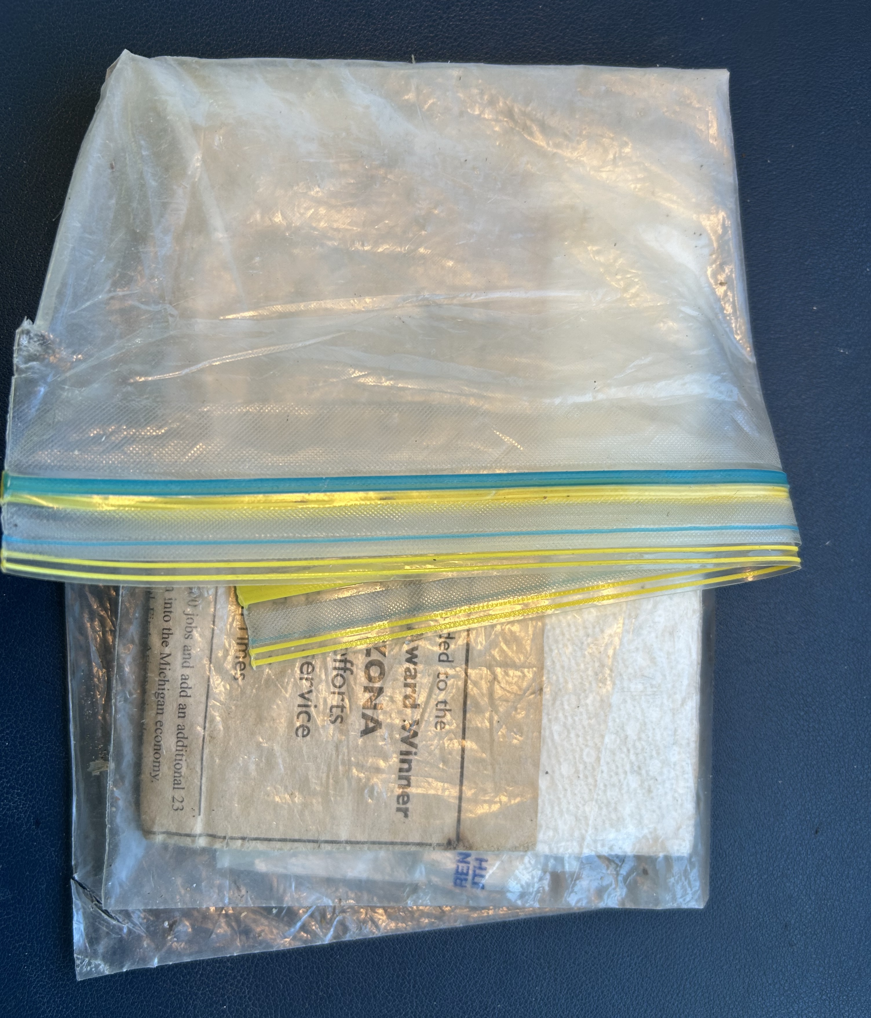 C. Sandwich sized Baggie: to hold carefully'folded toilet newspaper & contents'