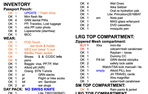 OVN Inventory List ensured I did not forget what was actually critical when totally dependent on just a small day pack: e.g. 3 days of my 'old guy' prescription drugs.