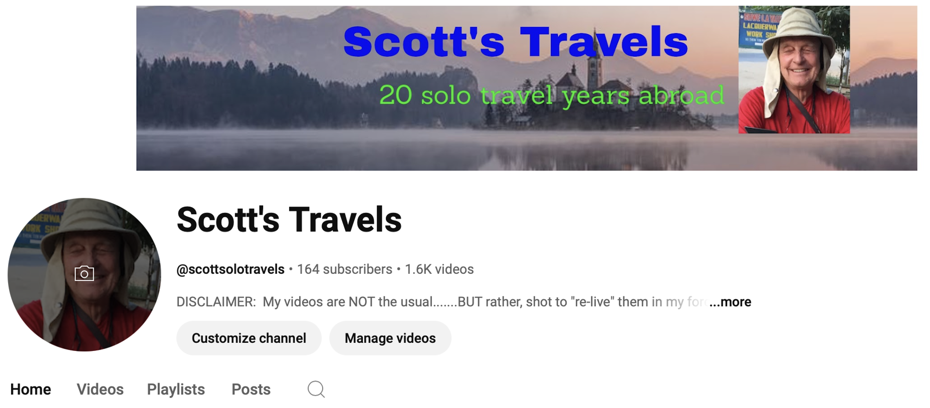 Only recently did I realize that YouTube provided the free technology allowing me to publish my 1400+ edited videos for others .<https://www.youtube.com/@scottsolotravels>