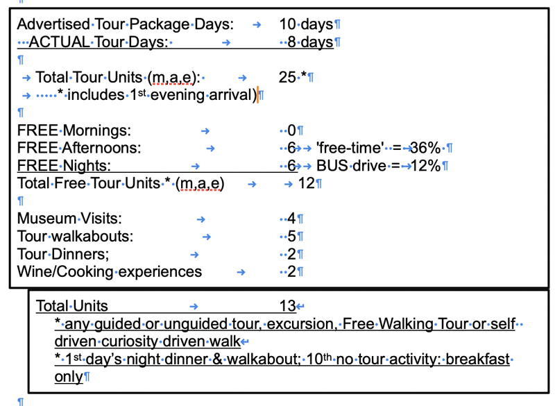 For example, on your arrival day I have only counted the night segment as part of the actual tour, which may often include orientation, dinner and a walkabout tour AND I have NOT counted the last day at all because it usually just your breakfast/departure day.