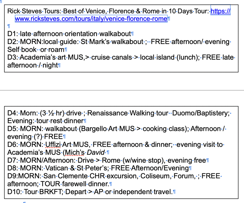 MY Rick Steves' EXAMPLE: ... available 'free-time' in one of Rick Steve’s older tour packages: Rick Steves Italy (Venice, Florence & Rome) 10 day (2023)”: https://www.ricksteves.com/tours/italy/venice-florence-rome