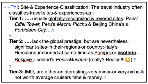 Remember, you only have to choose a Local Excursion that offers your MOST DESIRED Tier I & II sites & activities in each town you stay in overnight. The tour companies do all the logistics etc.