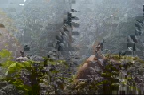 ANECDOTE: Mach Picchu, Peru (aka "Lost City of the Incas”): After a 1½ hr long train ride from Ollantaytambo to tiny Aguas Calientes village far below Machu Picchu & an evening walkabout, ... early next morning I rode up through the morning fog a 20 min bus ride up the steep switch-backed road to the site.